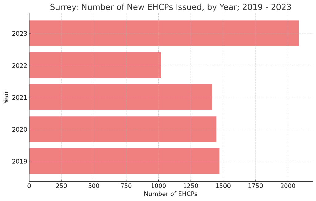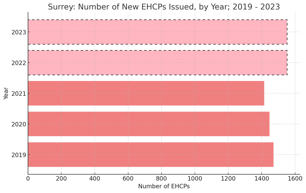 - Raw Data Volume of Surrey County Council New EHCPs, issued by year (2019-2023)