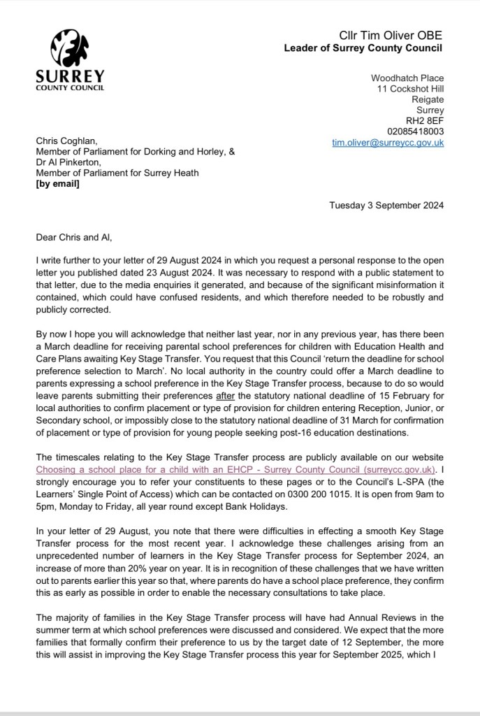- Despite significant feedback and new information emerging questioning the council’s approach and factual accuracy since this communication was first issued nearly 4 weeks ago, it remains the only official public statement from the Leader of Surrey County Council on the serious concerns being highlighted by these MPs, Families and Councillors.