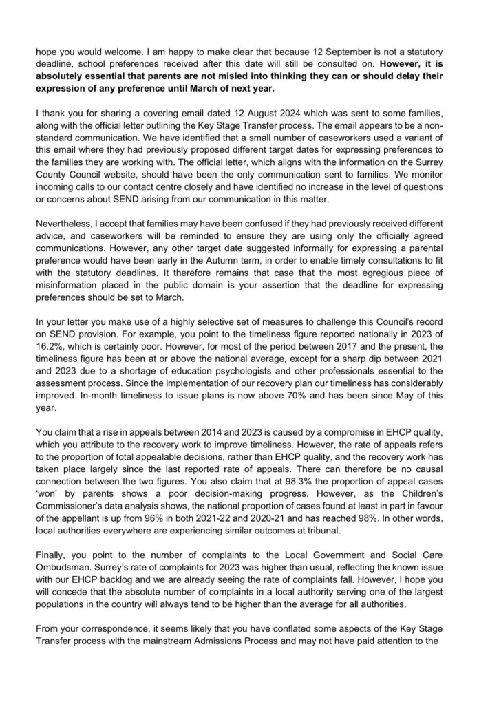 c) The statement issued by Surrey Education Services on 19th September 2024, which now appears to rewrite history by stating: “This letter included a request to seek parental preference, if possible, by the 12th of September.” By any standard, “by no later than” is quite different from “if possible.”