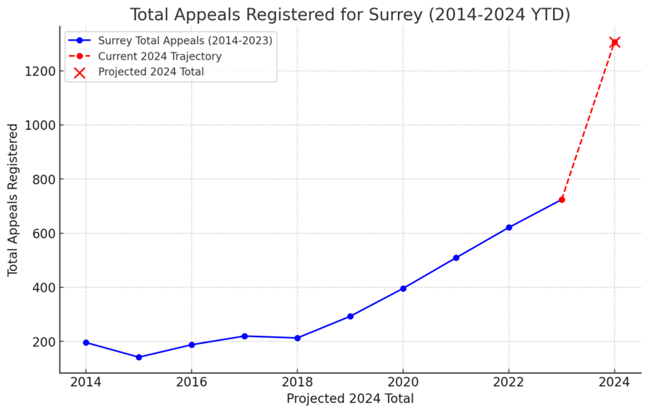 Even worse, while Surrey reports 823 appeals as of September, parents inform us the Tribunal Service takes up to six weeks to register new appeals. This means the true number likely reflects mid-August data at best. Earlier this year, we predicted that, without substantive intervention, Surrey would likely break all records with an estimated 1,100–1,300 legal appeals registered in 2024.